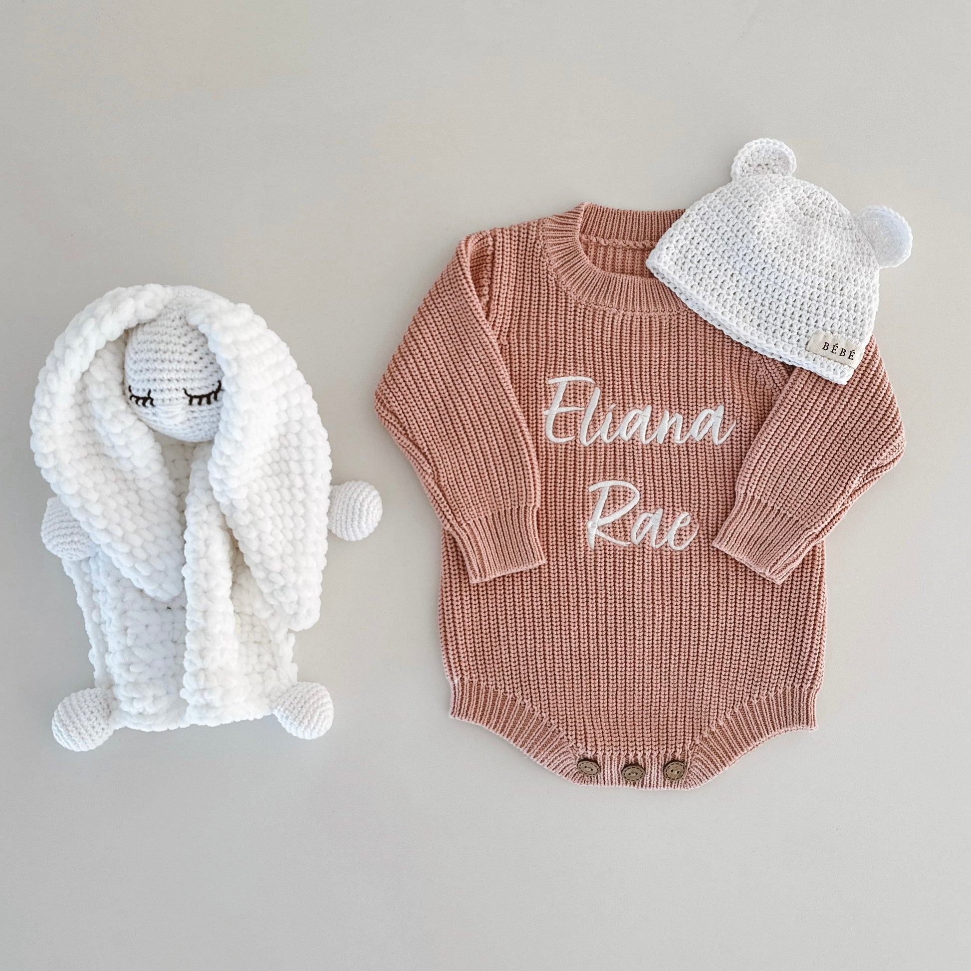 machine knitted rompers, embroidery done by Mama Irma