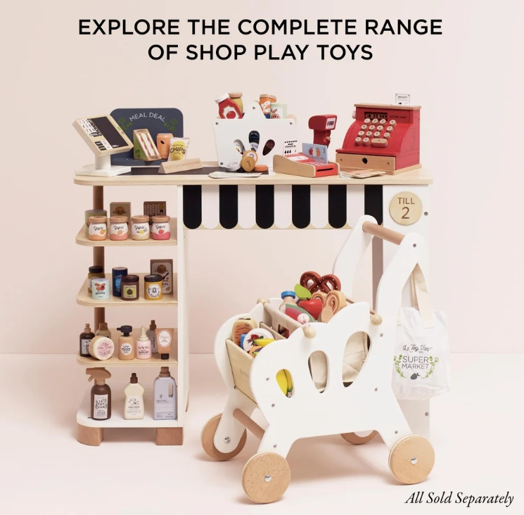 Featuring an iconic red body with natural wood, white and black details. Complete with paper money notes and wooden coins, little ones can practice counting and pretend shopping. The opening cash drawer adds a realistic touch, while the receipt slot and wooden push buttons make every transaction feel authentic. The rolling illustrated screen adds even more fun as they “ring up” their purchases.